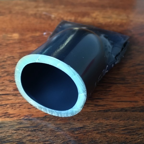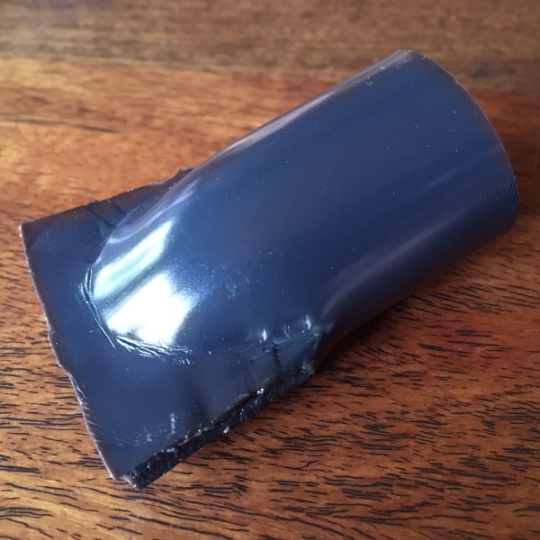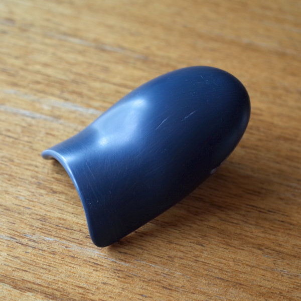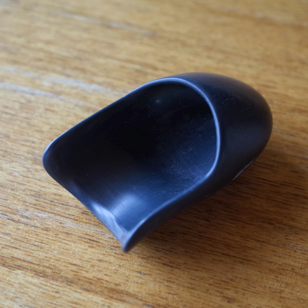 これも「できるだけ素手で弦を執る感じに近い堅帽子ユガケ」というコンセプトは同じですが、今回は耐衝撃性硬質塩化ビニル管(HIVP=High Impact ビニルパイプ)を加熱成形して作った竹林風(ボラ頭)帽子をすげてあります。木帽子よりも薄く作れますから、角入に近いフィット感になると思います。
