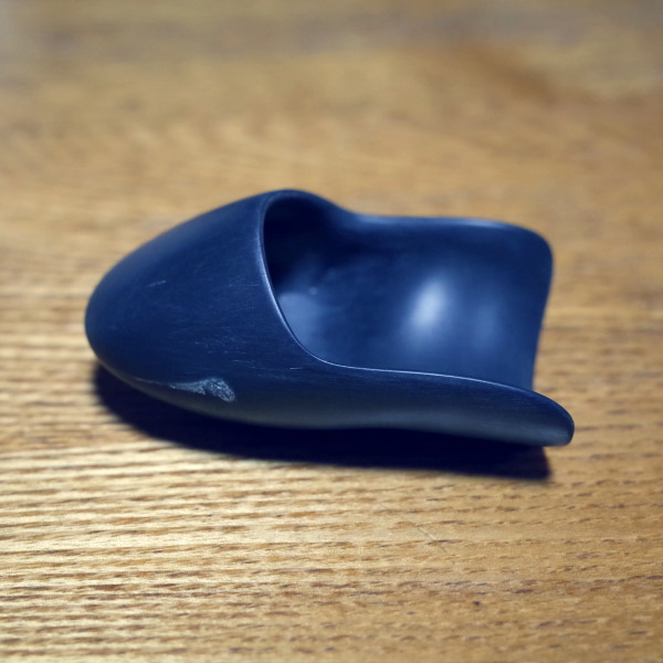 全体を削り込んでおおよそ節抜き帽子の形状になったら、ヒートガンで親指腹に当たる部分を温めて柔らかくしておいて、右手親指に被せた状態で実際に弓を弩きます。